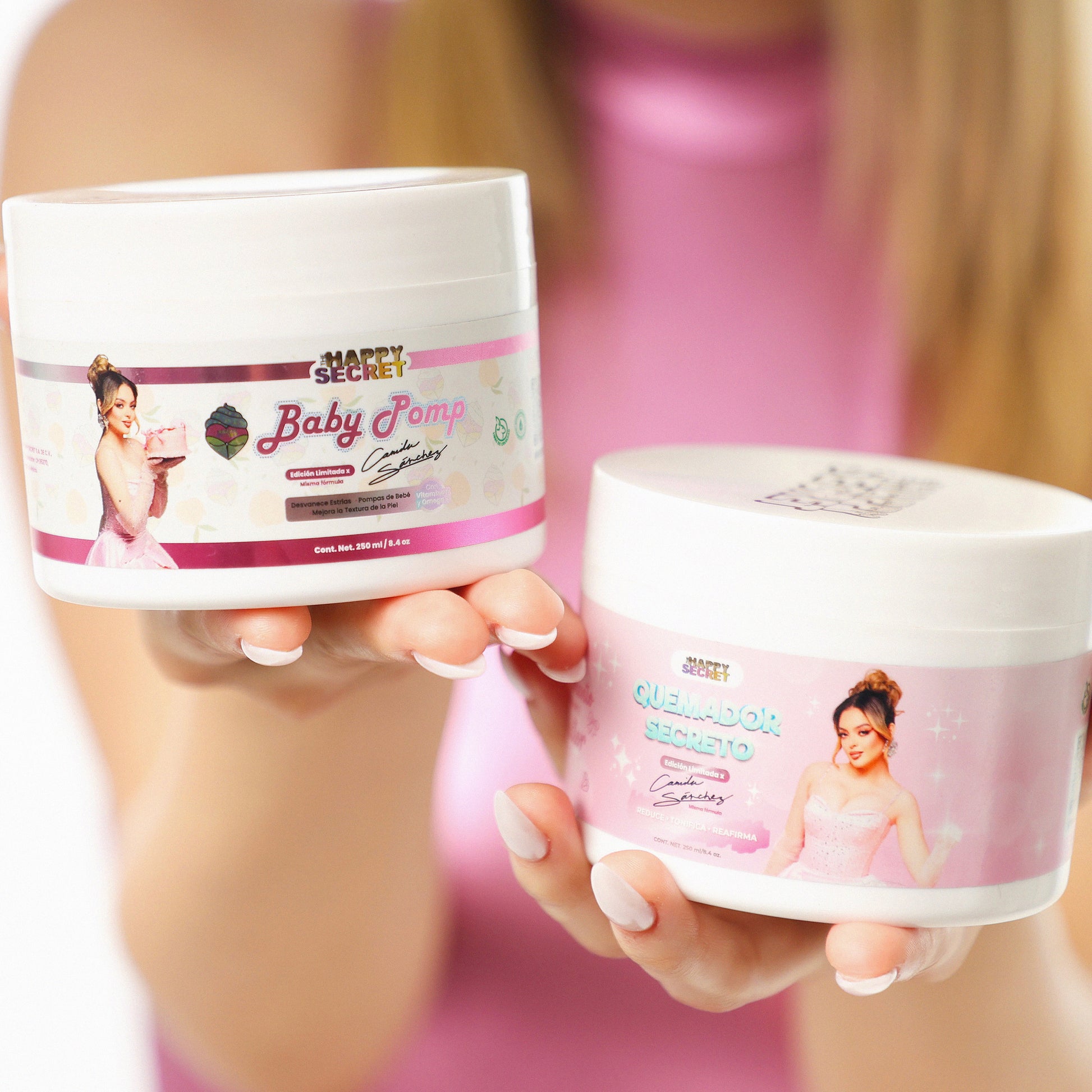 El QUEMADOR SECRETO es un poderoso gel para eliminar grasa localizada, puedes ponerlo en abdomen , brazos, piernas o los lugares que desees reducir. LA BABY POMP es exclusiva para las pompas, (también puedes usarlo en boobs) desvanece estrías y quita imperfecciones, además da volumen por las vitaminas que tiene incluyendo omega 3 y vitamina E.